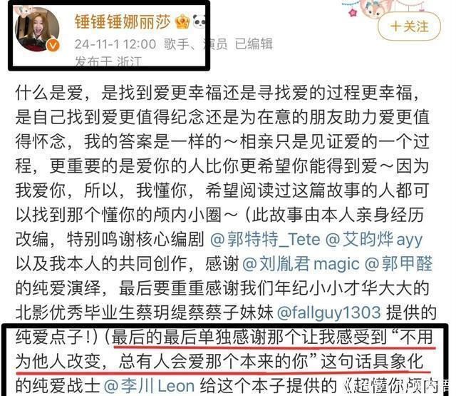 锤娜丽莎曾发文说,是李川让自己感受到“ 不用为他人改变,总有人爱那个本来的你。 ”